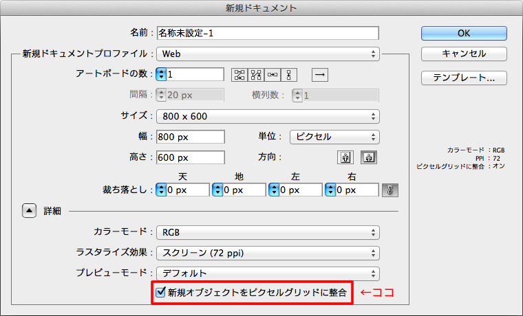 ただし、拡大・縮小などで小数点以下のサイズが発生したときは、形が崩れたりするようです。私自身はwebデザインにイラレを使わないので、詳しく検証はしていませんが…。